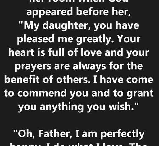 “My daughter, you have pleased me greatly. Your heart is full of love and your prayers are always for the benefit of others. I have come to commend you and to grant you anything you wish.”
