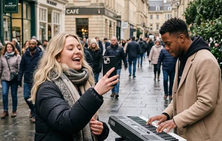 On a quiet street, a pianist played while people passed by, creating a relaxed and familiar atmosphere. It was one of those everyday performances where the music blends into the background of city life. A young woman stood nearby, holding her phone, appearing ready but slightly reserved.