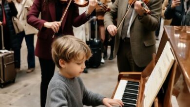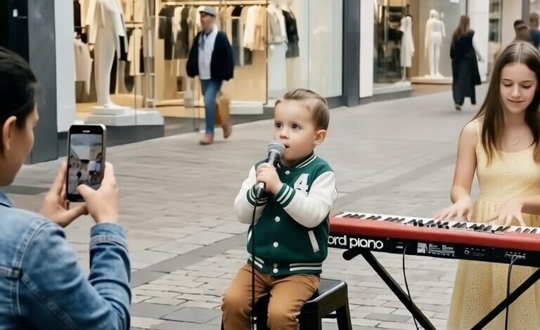 In the middle of a busy shopping district, where people typically pass by without stopping, a small performance setup quietly began drawing attention. A child sat on a stool in front of a microphone, accompanied by a keyboard nearby, as people moved through the space without initially realizing what was about to happen.