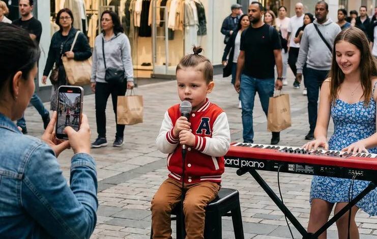 In the middle of a busy shopping district, where people typically pass by without stopping, a small performance setup quietly began drawing attention. A child sat on a stool in front of a microphone, accompanied by a keyboard nearby, as people moved through the space without initially realizing what was about to happen.