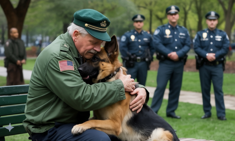 “Attack!” the officer barked. The command sliced through the afternoon air like a whip. The German Shepherd at his side surged forward, muscles tense, jaws ready. Bystanders gasped, children cried, parents clutched them tighter. All eyes fixed on the trembling old man sitting on the park bench, his hands raised and a weathered duffel bag at his feet.