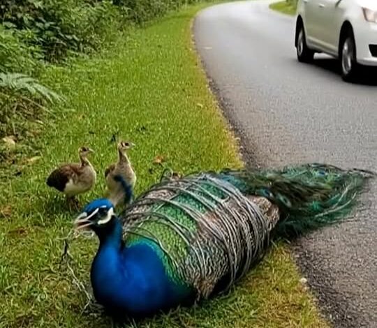 Imagine a quiet country lane, sunlight filtering softly through green trees, creating a tranquil scene. But one day, this peaceful setting is interrupted by a sight that catches your breath—an elegant peacock, its vibrant tail fully spread, lying helplessly on the grassy verge, caught in cruel wires.