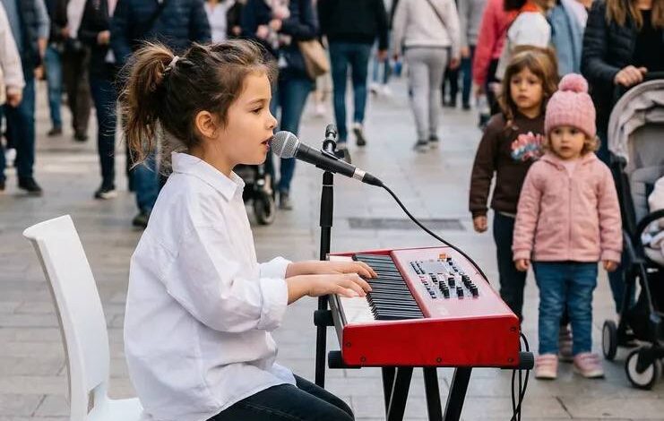 As the young girl sat behind her keyboard, passersby initially walked past without much attention. Dressed simply and surrounded by everyday street noise, the setting felt ordinary at first glance.
