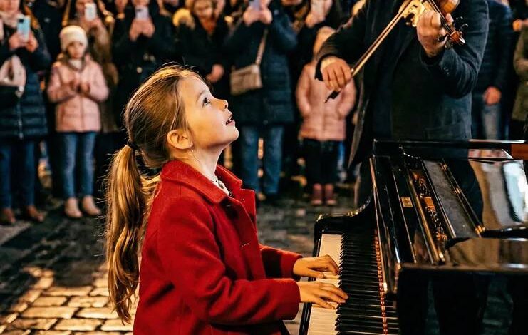 A young pianist sat at a grand piano placed among the glow of streetlights and decorative fixtures. Around her, a crowd had gathered — some standing, others sitting along the pavement, all drawn in by something they couldn’t fully explain at first.