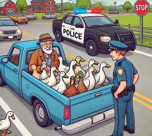 A policeman pulls over an old man driving a pickup truck with the bed overflowing with ducks.