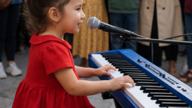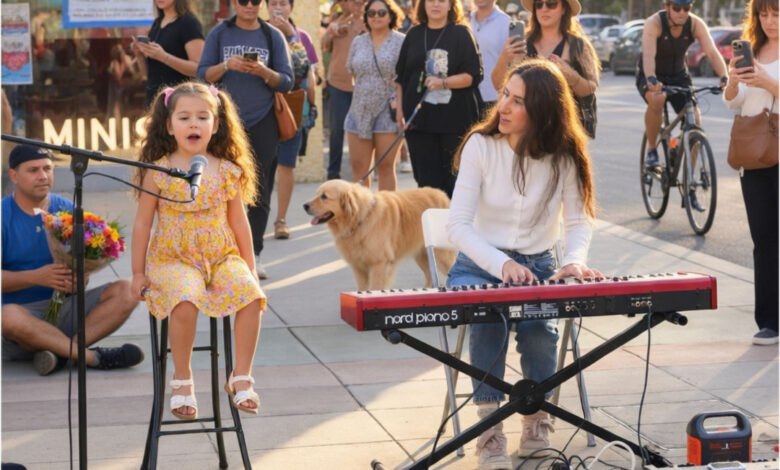 A small street setup featuring a young child initially appeared like many others—simple, casual, and easy to overlook. Sitting on a stool with a microphone in front of her, the young performer seemed calm and focused.