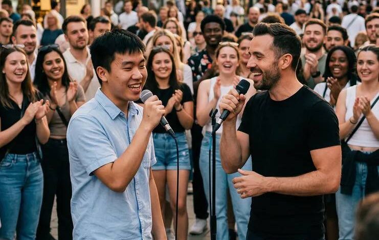 In a busy street filled with noise, movement, and constant distractions, it’s easy for performers to blend into the background. On this particular day, a small group gathered around a street musician, with the usual mix of curiosity and casual attention. Among them was a young man, encouraged by his friends to step forward and sing.