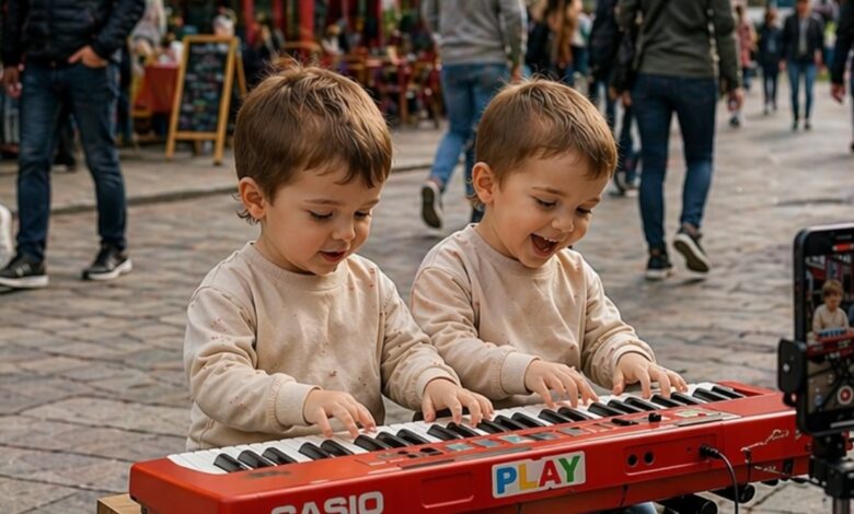 Two twin boys stood by a keyboard on a busy street, sharing a quiet moment that looked more like play than performance. People passed by without thinking twice, caught up in their own routines.