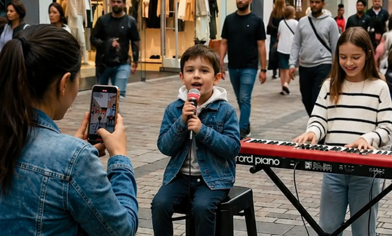In the middle of a busy shopping district, where people usually pass by without a second thought, a small performance began to take shape. A child sat on a stool in front of a microphone, with a keyboard nearby, blending into the everyday rhythm of the street.