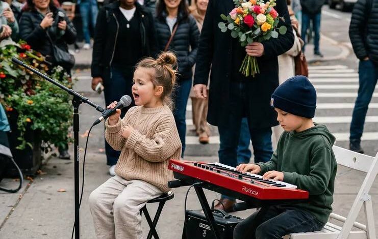 What started as a simple setup on a busy sidewalk quickly turned into something that caught everyone off guard. A very young child sat in front of a microphone, with another child beside her at a keyboard, creating what looked like a casual street performance.