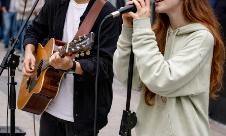 A young singer stood beside a guitarist, appearing calm and composed, as if preparing for something routine. The crowd around them watched with casual curiosity, unsure of what to expect.