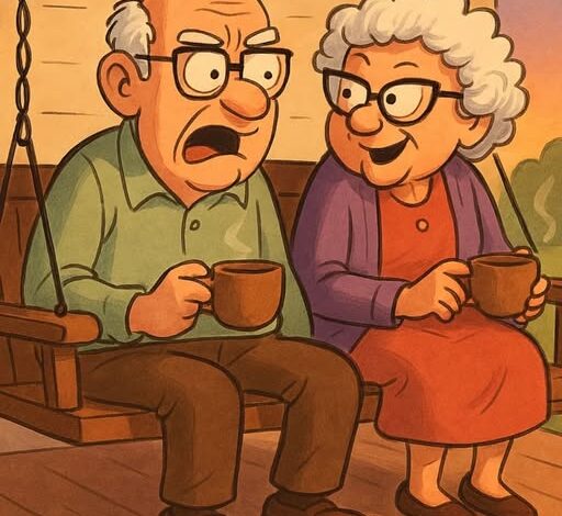 An elderly couple, Bert and Edna, are sitting on the porch swing