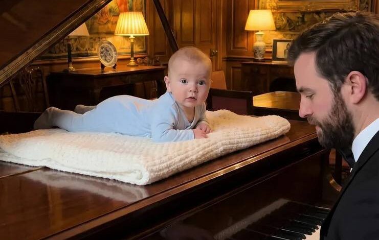 In a softly lit room filled with classical decor, a pianist sits at a grand piano, playing gently as a baby rests just inches away. The setting feels calm, almost timeless, as if the moment itself is meant to be remembered.