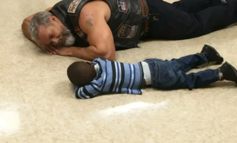 “You’re okay, buddy,” the biker whispered. “The loud noise is gone. You’re safe now. Nobody’s gonna hurt you.”
