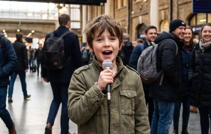 In a busy indoor station filled with travelers and constant movement, a young boy stepped up to a microphone as part of a street performance setup. With people passing by and announcements echoing in the background, the setting was far from quiet.