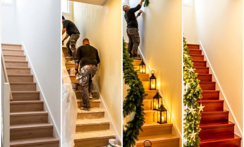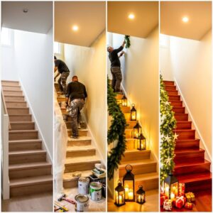 Below, you’ll find the full image collage of the finished staircase — including close-up lighting details, railing décor, and the polished steps. This renovation stands as a reminder that even a simple architectural feature can become the heart of a home with thoughtful design and seasonal styling.