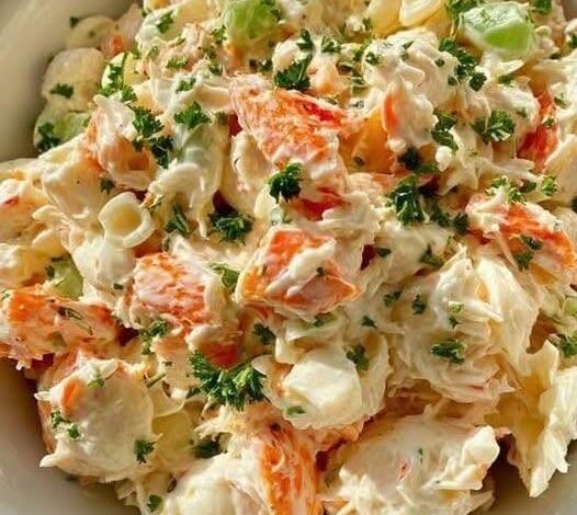 This simple and quick seafood salad combines shredded imitation crab with a creamy dressing, crisp vegetables, and a touch of fresh lemon and dill for extra flavor.