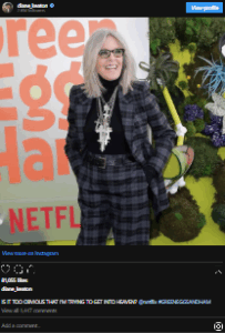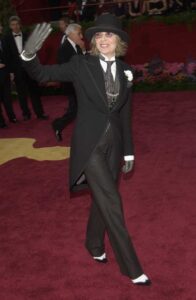 While most celebrities flaunt glitzy gowns or barely-there outfits, Keaton sports a tailored suit or a fitted shirt with high-waisted pants. She’s also not afraid to wear a turtleneck.