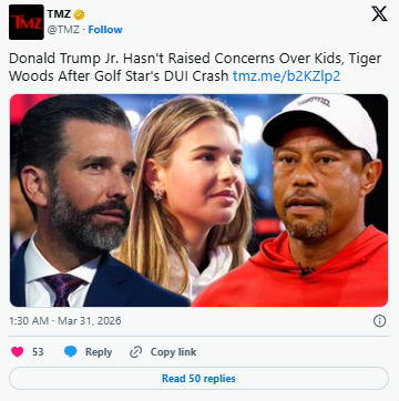 That matters because stories like this often invite people to turn private relationships into public theater. Woods is dating Vanessa Trump, Donald Trump Jr.’s former wife, and that alone guarantees extra attention. But the more grounded angle is not rivalry. It is restraint. Reports say Trump Jr. has not tried to make the crash into a bigger family confrontation and has instead stayed focused on stability for the children they share. People, citing TMZ-style sourcing around the family, said he was mainly grateful Vanessa and the children were not involved.