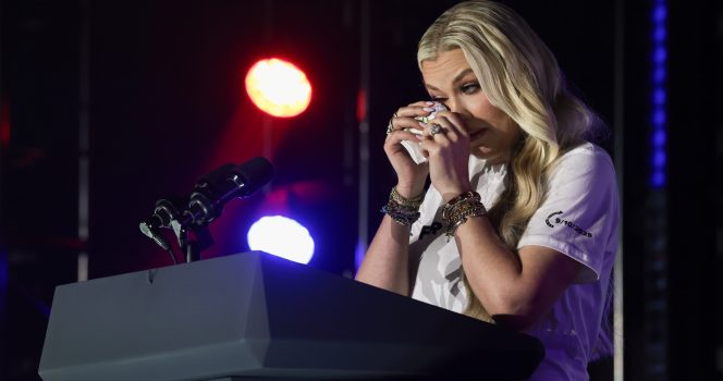When Kirk makes the mistake, she immediately follows up with an excuse, “Despite the devastating loss of Charlie Kirk, my incredible husband… Caleb has persisted with the same grift,” before she quickly adds, “Excuse me, gift,” and then correcting herself one more time to say, “grit.”