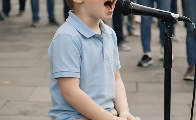 A young boy sat quietly on a stool with a microphone in front of his, blending into the background of a busy street. People walked past without a second glance — it looked like just another ordinary performance.
