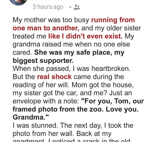 When my grandmother, Grace, passed, my mother and sister carved up the big-ticket items like they’d been preassigned. Mom took the house she’d been coveting for years. Cynthia slid into the car she’d “borrowed” so often it already smelled like her perfume. At the reading, the lawyer turned to me and set a single, wrapped parcel in my hands—an old photo of Grandma and me at the zoo. I was six with crooked pigtails; she was holding my hand while a giraffe bent low as if bowing to her.