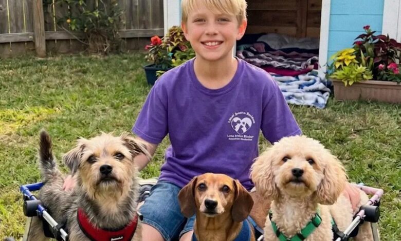Over the next two weeks, our backyard transformed into a hybrid workshop. Ethan scavenged for parts, dragging out old bikes, a discarded stroller, and even spare wheels from a neighbor’s lawn equipment. PVC pipes stacked up against the fence like a skeletal construction project. Every afternoon after school, he was out there measuring, cutting, and adjusting. He was building custom wheelchairs for the dogs’ immobile back legs. There were many failed attempts and countless hours spent watching tutorials, but eventually, he succeeded. The first time he fitted the dogs into the frames, the yard was silent. Then, a wheel rolled. Then another. When all three dogs began to move across the grass on their own, Ethan’s laughter filled the yard with a joy that felt like a triumph over darkness.