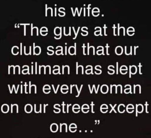 He leaned back, watching her over the rim of his mug, and said casually, “You know, the guys at the club were saying the mailman’s slept with every woman on our street…”