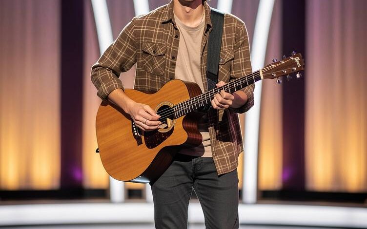 The young performer walked onto the stage carrying nothing more than an acoustic guitar and a quiet determination. His relaxed appearance—wearing a brown plaid shirt and holding his guitar close—gave little hint of the emotional weight behind the song he was about to perform.