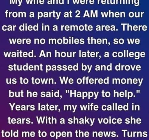 It was 2 a.m. on a desolate stretch of highway when the engine sputtered and died, plunging us into a suffocating, absolute silence. Stranded in the pitch-black void with no cell signal and not a single passing car, the creeping dread of isolation began to take hold. We were vulnerable, exhausted, and utterly alone until a pair of headlights finally cut through the gloom. A young man stepped out of his modest car, offering help with a grace that felt… Continue reading…