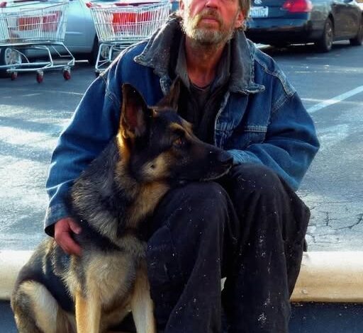 He was sitting on the curb near the cart return, shoulders hunched, trying to take up as little space as possible. Next to him was a large German Shepherd, pressed close against him like it was guarding him—or maybe the other way around.
