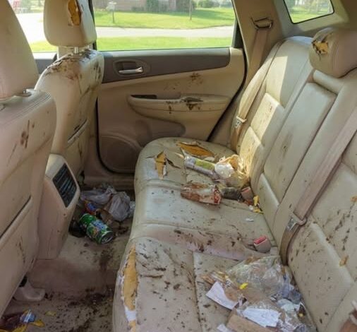 Crushed chips, sticky cup holders, crumbs, grease stains, juice spills on the seats, and fast-food bags everywhere. The smell hit me like a slap.