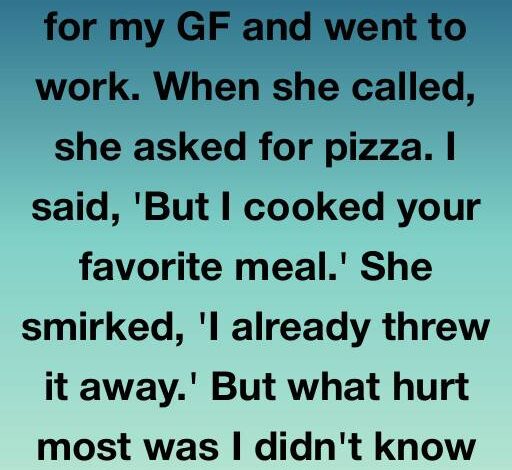 I spent all day cooking for my GF and went to work. When she called, she asked for pizza. I said, “But I cooked your favorite meal.” She smirked, “I already threw it away.” But what hurt most was I didn’t know she had been cheating on me for months.