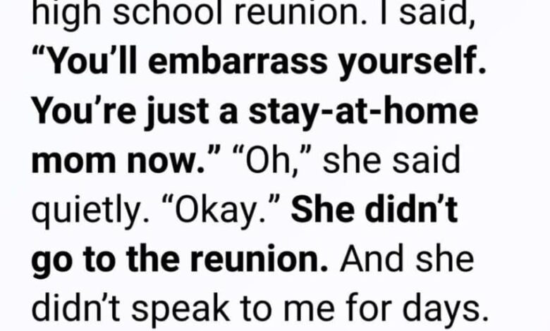 “So you can tell everyone you stay home with the kids all day?” I said. “Your friends are probably surgeons, lawyers, executives. What are you going to say? That you’re just a stay-at-home mom?”