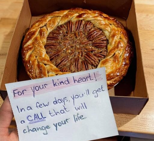 The receptionist handed me a small cardboard box with my name written in neat, looping handwriting. No return address. I opened it right there at the front desk. Inside was a perfectly baked pecan pie, golden and glistening, with powdered sugar dusted like snow on top.
