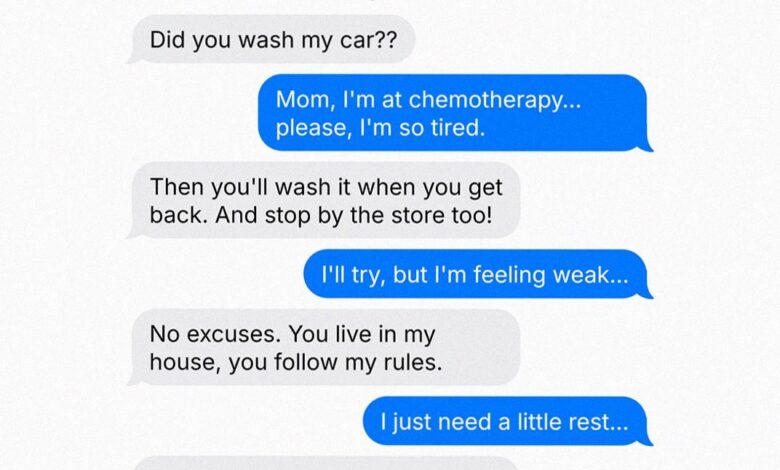 Even when I was at the clinic, hooked up to an IV, she texted me lists of errands: “Pick up milk and cookies on your way back. Don’t forget to vacuum. Wash my car today.” Her demands never paused, not even while poison dripped into my veins.