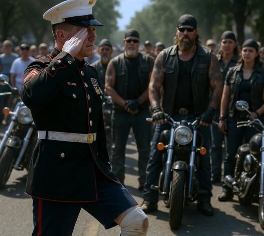 Without exchanging a single word, the bikers moved with coordinated precision, forming a tight, protective semicircle around the exhausted Marine. One by one, they stood at rigid attention. Then, in a perfect, unified motion that spoke of discipline and respect, they raised their arms in a salute. The sight was instantly powerful, deeply moving, and transformative. For several long minutes, they stood unmoving, united with Tim in honoring the fallen—a silent, powerful promise of eternal remembrance.
