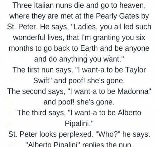 At the Pearly Gates, beneath clouds arranged as neatly as a gallery display, three Italian nuns arrived together after long lives devoted to service, prayer, and quiet devotion. They stood side by side, hands folded, habits perfectly pressed, faces calm and curious. St. Peter greeted them warmly, smiling as he checked their names off a brilliantly glowing list.