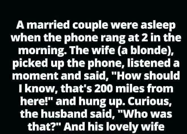 The wife — a cheerful blonde — sleepily reached for the receiver, listened for a few seconds, and said,
