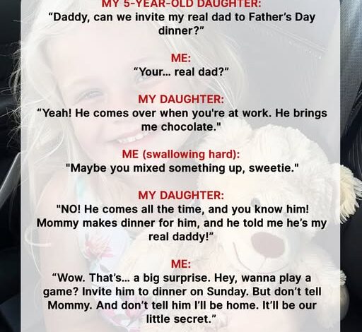 “Wow,” I said, thinking quickly. “That’s… a big surprise. Hey, tell you what, sweetheart, wanna play a game? Invite him to dinner on Sunday. But don’t tell Mommy. And don’t tell him I’ll be home. It’ll be fun, and our little secret.”