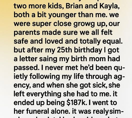 The sum—$187,000—didn’t feel real at first. My hands shook as I read the letter again and again. She had chosen me, not just once, but twice. First by giving me a chance at life with another family, and now by leaving me her legacy. It felt like a bridge across time, a silent way of saying, I never forgot you.