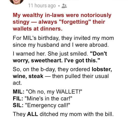 My in-laws had a habit everyone in the family knew about but pretended not to see. They were wealthy, polished, and always dressed like they’d stepped out of a magazine — but when the restaurant bill arrived, they suddenly became helpless. Forgotten wallets. Lost purses. “Oh no, I must’ve left my card in the other coat.” It was their signature move. They’d order the most expensive dishes on the menu, enjoy every bite, and then vanish behind a wall of excuses. Someone else always paid.
