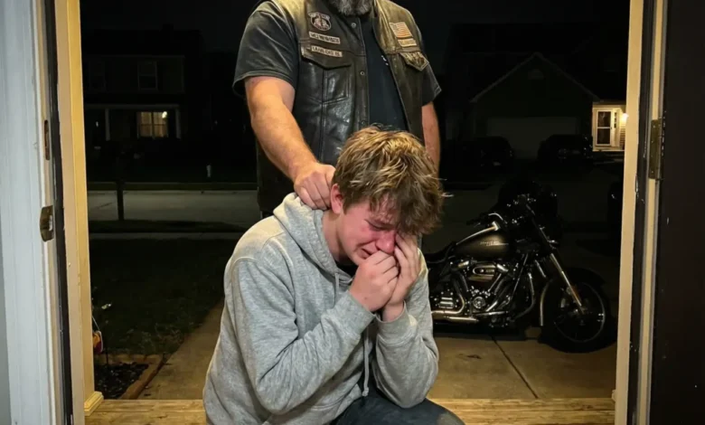 Through the window, I watched the massive figure climb off his motorcycle. Leather vest. Patches everywhere. Arms covered in tattoos. Behind him was a boy. His son. The kid who’d made my son’s life a living hell since fifth grade.
