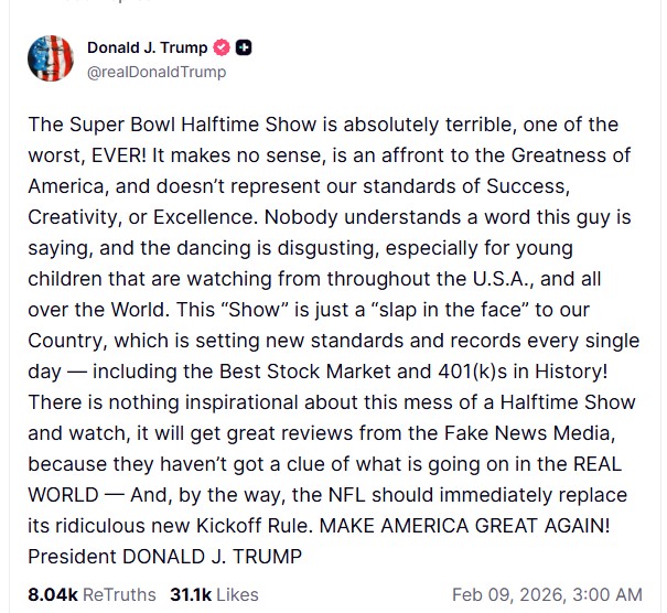 “The Super Bowl Halftime Show is absolutely terrible, one of the worst, EVER!” Trump wrote. “It makes no sense, is an affront to the Greatness of America, and doesn’t represent our standards of Success, Creativity, or Excellence. Nobody understands a word this guy is saying, and the dancing is disgusting, especially for young children that are watching from throughout the U.S.A., and all over the World.”