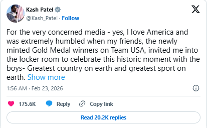 It didn’t take long before Kash Patel decided to respond to the criticisms. On X, the FBI Director wrote, “For the very concerned media … yes, I love America and was extremely humbled when my friends, the newly minted Gold Medal winners on Team USA, invited me into the locker room to celebrate this historic moment with the boys — Greatest country on earth and greatest sport on earth,” Patel wrote, adding praise to the hockey team. “Unity, Sacrifice, Attitude — what it takes to be the best in the world…“