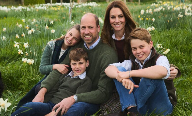 In the serene springtime setting, Charlotte rests her head on William’s shoulder while holding his arm, and Louis leans comfortably against his father’s chest. Princess Catherine wraps an arm around her eldest, smiling warmly at the camera. The simple message reads: