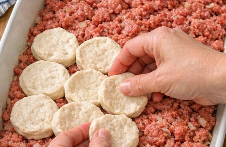 Step 5: Top with Biscuits: Open the can of biscuits and separate them. Arrange them in a single layer on top of the beef. Don’t worry if they don’t cover every single inch; they will puff up and spread out as they bake.
