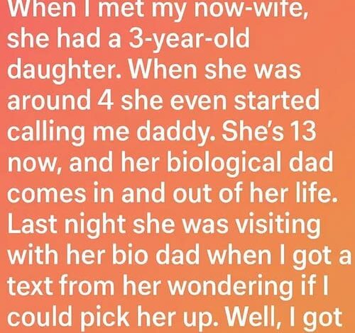 She was three when I met her, all curls and cautious eyes, clutching a stuffed giraffe that had seen better days. By four, she started calling me “Daddy” on her own, like it had always been my name. She’s thirteen now. Her biological father drifts in and out like bad weather. Last night she was with him when my phone lit up: “Can you come get me?” I drove over. She was already outside with a backpack, climbed in, buckled, and asked—voice small—“Can I just call you Dad again? For real this time?” I laughed, I cried, I squeezed her hand, and I kept driving.