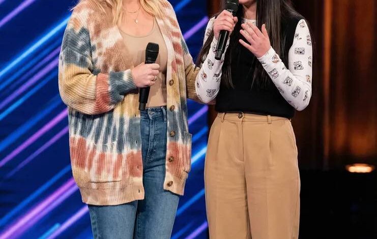 The mother, dressed in a vibrant tie-dye cardigan layered over a neutral top and jeans, stood calmly with a handheld microphone. Beside her was her daughter — long dark hair, wearing a white long-sleeve shirt with delicate graphics on the sleeves, a black sleeveless vest layered over it, and high-waisted tan trousers. Her expression shifted between nervous laughter and disbelief as the situation unfolded.