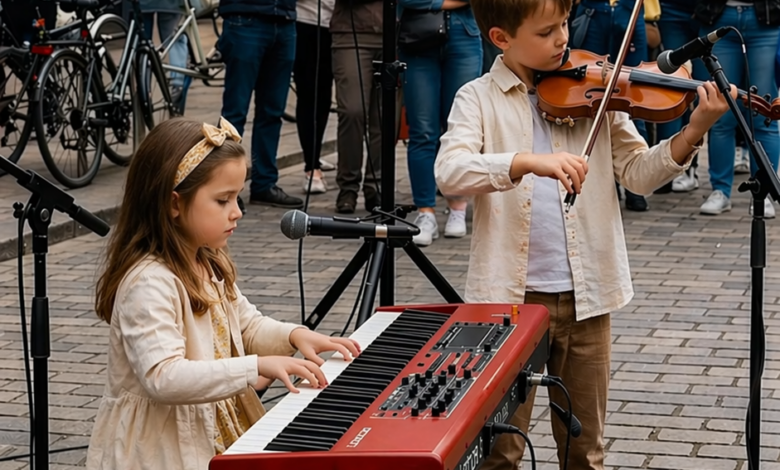 The music was shockingly polished — piano and violin blending perfectly, far beyond what anyone would expect from kids their age. People who were just passing by suddenly stopped, drawn in by the sound.